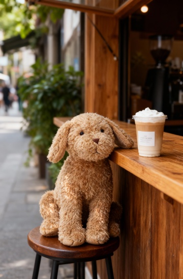保持产品不变的情况下,材质不要变,狗狗坐在迷你藤编椅上,前爪 “捏着” 半块微型可颂面包,面前的迷你木桌上摆着微型牛奶杯;背景是马卡龙蓝色色调的微型面包店(橱窗里露着迷你法棍),旁侧靠放着微型木质面包篮,清晨柔和晨光洒在玩偶蓬松的绒毛上,整体是治愈早餐的拟人微型场景。