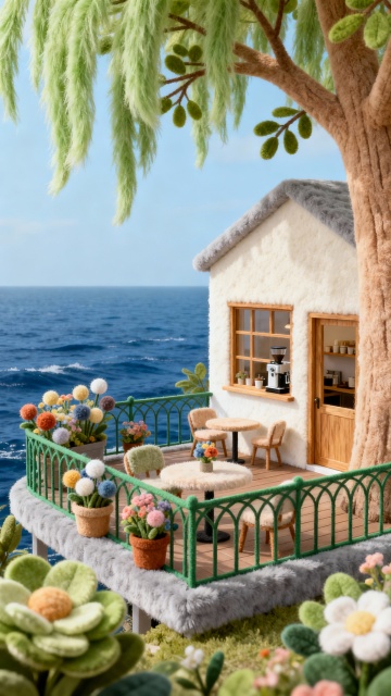 甜品店靠窗下午茶桌的毛绒提拉米苏,浅咖色毛绒表层撒深棕毛绒可可粉,分层呈现奶白毛绒芝士层与深棕毛绒饼干底,搭配毛绒咖啡杯、木质餐垫,侧光照射形成柔和阴影,背景有绿植和甜品菜单,复古温馨