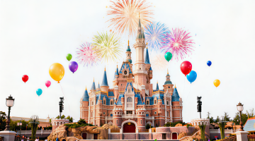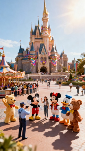 微缩艺术风结合卡通感与喜庆氛围,3D风格呈现梦幻城堡与经典角色互动场景,实景感十足,节日庆典气息浓厚。
