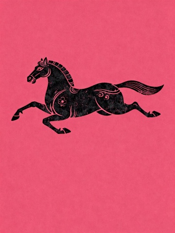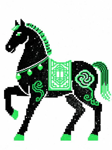 新中式扁平插画风格,无地面,无阴影,颜色淡雅,渐变色彩,复杂的设计风格。通过复杂的形状和色彩,极简艺术海报,一只装饰华丽的生肖马插画(全身完整马体),马悬空漂浮于画面中心,马身主色调(渐变深浅宝蓝),布满小花暗纹;装饰细节包括:脖子球形饰品、珠串挂饰(搭配流苏)、带有复杂纹理的鞍具,从它的马笼头上垂下丝绸流苏,附着在马鞍上的流苏马的姿态呈腾跃状,线条柔美且富有动感,马前蹄勾起,浅绿和金黄色相间彩马鬃,纯白色背景。中式传统美学与现代插画结合,色彩浓郁华贵宝蓝 + 姜黄 + 乳白 + 薄荷绿,装饰细节繁复精致,兼具古典雅致与视觉华丽感。光影层次感强烈,抽象表达,高清,颜色鲜明,高级优雅,近实远虚(远离镜头的腿虚化,颜色变浅)