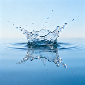 一张高清晰度的水形态创意摄影,以纯净的浅蓝色渐变背景为衬托,水面平静如镜,倒映着上方跃动的水流。画面中央,清澈透明的水从水面向上涌起,凝固成一朵优雅绽放的水晶般水花,水珠晶莹剔透,边缘泛着柔和的高光,细小的水滴如钻石般四散飞溅,悬浮在空气中,呈现出灵动而富有张力的动态瞬间,光影效果柔和自然,营造出宁静、纯净且充满生命力的氛围。