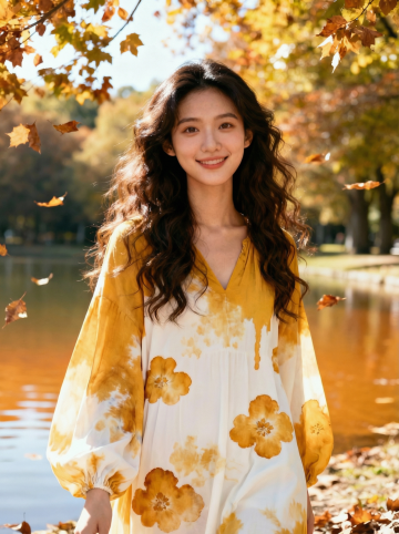 写实风格人像摄影,亚洲美女,长卷发,明亮有神的眼睛,自然微笑,白皙肌肤,穿着复古格纹背带裙搭配白色泡泡袖衬衫,站在秋日落叶纷飞的公园湖边,阳光透过树叶洒下斑驳光影,湖水呈现温暖的琥珀色调,整体氛围清新治愈,高清细腻质感,柔和自然光线,浅景深,突出主体人物。