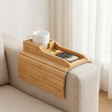 保持参考图主体不变,主体物品:原木色仿木质(或实木)沙发扶手托盘,造型为可卡在沙发扶手上的分层结构,带有杯槽和手机放置区 物品摆放:托盘杯槽中放着一个白色陶瓷水杯(内有水),托盘平面上放置智能手机,使用场景:托盘卡在浅米色沙发扶手上,背景是简洁的浅色墙面 / 窗帘,整体风格干净明亮 细节质感:托盘表面有木纹纹理,边缘有防滑设计;