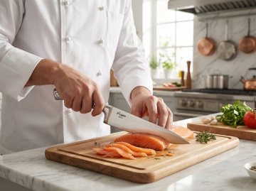 一位穿着黑色围裙的男性厨师,双手正握着一把锋利的厨刀,在木质砧板上精准地切割新鲜的红色生肉块,砧板上和旁边的竹篮里也堆放着多块纹理清晰的肉块,整体画面采用暖色调自然光摄影风格,光线从斜上方照射,突出肉块的鲜嫩质感和厨师手部的肌肉线条,背景为简洁的深色木质墙面,营造出专业、质朴且充满生活气息的厨房环境,高分辨率细节清晰,无任何文字和水印。