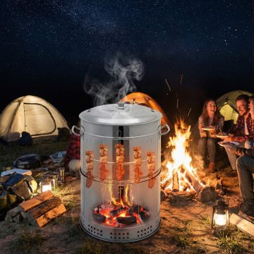写实风格美食摄影,特写镜头下一位穿着白色围裙的厨师正在户外露营环境中烧烤,左手握着几串滋滋冒油的烤肉串正从炭火上拿起,右手也持着烤串,烧烤架上摆满了各种烤肉和烤蔬菜,火焰熊熊燃烧,升腾起袅袅青烟,肉质呈现出诱人的焦香色泽和清晰纹理,周围是自然的露营场景,有帐篷、树木和户外桌椅,整体色调温暖,光影对比强烈,突出食物的质感和烧烤的烟火气,营造出户外露营烧烤的热闹、惬意氛围。