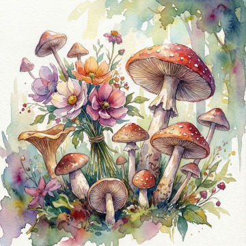 系列素材集合,规整排布于纯色背景上,保持手绘水彩质感,边缘略带模糊,中心细节清晰,整体色彩变换,包含四个完全不同的元素内容:第一个为橙红色灵芝,菌盖呈螺旋状,表面有光泽;第二个为紫色葡萄串,果实饱满,藤蔓缠绕;第三个为绿色荷叶,边缘卷曲,叶脉清晰;第四个为黄色向日葵,花瓣层层叠叠,花盘呈棕色。每个元素均独立存在,大小相近,均匀分布于画面中,整体风格统一,色彩鲜明。