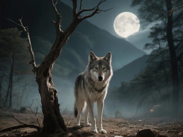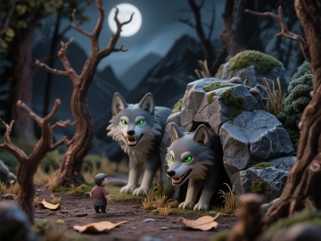 3D风拟人狼战士,毛发旺盛,手持巨斧,超现实主义风格,森林中散发神秘感。