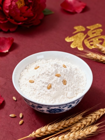 国潮风实景图,重拟物设计展现面粉与麦穗的细腻质感,红金配色烘托喜庆氛围,印刷风文字点缀,中式年味浓郁。