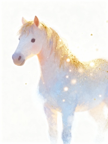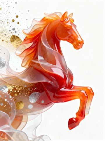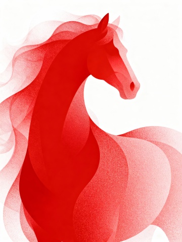 梦幻感与唯美感交织,白描线条勾勒骏马轮廓,粒子风点缀星芒,浮雕质感跃然纸上,插画风呈现优雅意境,暗红底色衬托节日祥瑞之气。