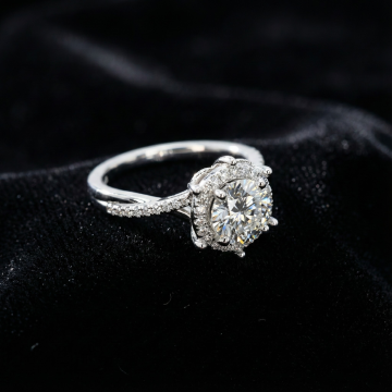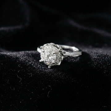 一枚奢华的钻石戒指,主石为一颗巨大、璀璨、切割完美的圆形钻石,镶嵌在六爪铂金戒托上,戒臂两侧点缀着细小的圆形钻石,整体设计简约而优雅,白色背景,钻石闪耀着耀眼的光芒,具有极高的光泽度和透明度,金属部分呈现出银白色的金属质感,表面光滑细腻,光影效果自然,立体感强。