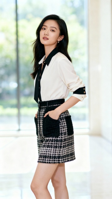 一位女性模特穿搭展示,身着白色短袖翻领衬衫,衬衫有胸前口袋和纽扣设计,搭配黑色中长款A字半身裙,脚穿米色运动鞋和白色中筒袜,右手自然下垂拿着一个棕色布面包袋,左手插在裙兜里,整体姿态自然放松。画面采用简约写实风格,背景为浅灰色纯色,光线柔和均匀,呈现出舒适、日常的穿搭氛围,色彩以黑白棕为主色调,和谐统一,突出服装的剪裁和质感。