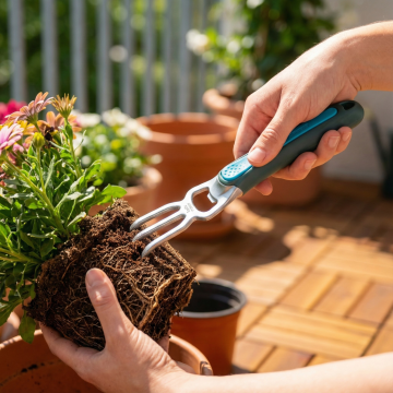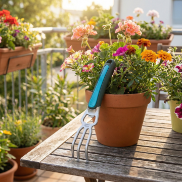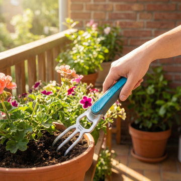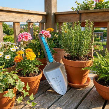1:1产品场景图,阳光明媚的阳台,图片中的人物使用园艺铲子铲桌子上的泥土,突显产品,不用出现人物面容