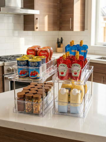 一个明亮整洁的现代厨房,采用简约优雅的设计风格,以白色为主色调,搭配黄铜色金属装饰细节。厨房整体呈现出温馨舒适的氛围,阳光透过百叶窗洒入,在白色橱柜和大理石台面上形成柔和的光影效果。白色的橱柜带有黄铜色的圆形拉手,上方的吊柜和下方的地柜组合提供了充足的储物空间。大理石台面光滑洁净,带有自然的灰色纹理。台面上有一个双槽不锈钢水槽,搭配黄铜色的水龙头。水槽旁边的金属桶里插着木质的锅铲和汤勺。墙面安装着黄铜色的挂杆,上面挂着各种木质和金属材质的厨房用具,包括勺子、铲子等。挂杆上方的白色搁板上摆放着不锈钢和玻璃材质的储物罐,里面装着各种香料和食材。台面上还摆放着一个白色的盘子,里面放着几块叠在一起的三明治,旁边还有一盘色彩鲜艳的沙拉。整体构图采用了三分法,光线从左侧窗户进入,营造出明亮通透的感觉,细节丰富,质感细腻,展现出干净利落的现代厨房设计感。