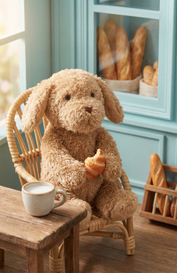 保持产品不变的情况下,细节材质不要变,野餐垫旁・小口琴:它凑在餐垫边,软爪捏小口琴贴在圆鼻尖,“呜呜” 调子混着面包香飘开,条纹角蹭过轻晃的餐布,尾带被风兜得飘起,蹄尖轻点餐垫打拍,尾巴参考第三张,不要长毛毛,尾巴不要变