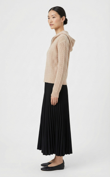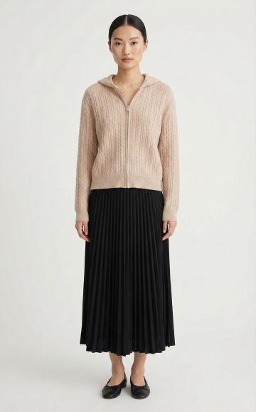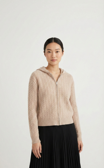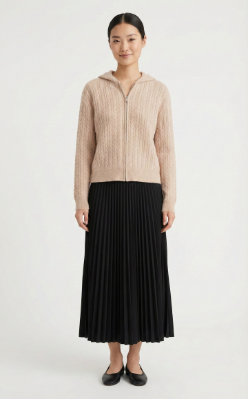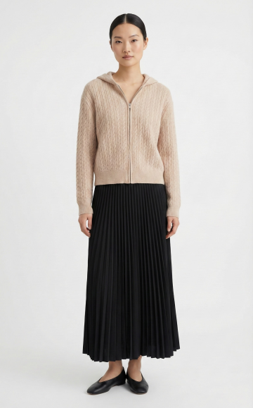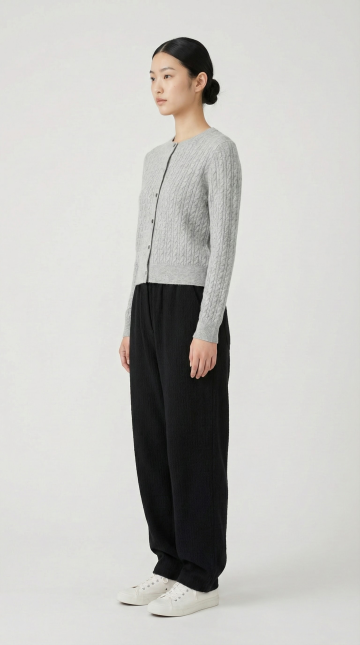 保留衣服主体,帮我生成5张电商主图。核心元素:东亚女性瘦模特(黑色长发低扎、气质清冷),25岁左右,健康肤色,有气质,淡妆,中长款开衫外套(无扣开襟 + 宽翻领设计,版型宽松(不挑身材),长度大概到臀部 / 大腿位置针织面料(可能是羊毛混纺或棉质),表面有轻微的肌理感两侧有贴袋,实用且增加休闲感),黑色尖头低跟鞋。人物动作1:身体自然站直,肩膀放松(没有耸肩或含胸),双臂轻垂于身体两侧(手部自然放松,未刻意摆造型),双腿微分开(脚尖自然朝前),整体呈现舒展、放松的状态。人物动作2:身体站直但不僵硬,双臂自然背在身后(肩部舒展,没有紧绷感),双腿微错开站立(重心更稳且显松弛),手部未露在身前,让视觉焦点集中在服装本身。人物动作3:身体侧转(呈现侧身角度),头部微低、视线自然下垂,同时一只手轻抬至额前(手指放松、未用力),另一只手自然垂于身侧,整体动作轻盈不刻意。人物动作4:身体侧向镜头(约 45 度角),上半身轻微前倾,一只手臂自然背在身后(手部放松露出指尖),头部转向镜头方向,整体肢体舒展不紧绷。人物动作5:身体呈侧身角度,上半身自然舒展,一只手臂轻搭在身侧(手部放松、指尖轻触裙摆),双腿因开叉裙呈现微错开的状态,整体没有紧绷感,动作轻盈自然。场景与构图:纯色浅灰色背景(无杂物),居中构图,竖幅画面,模特占据画面主体(全身展示),镜头焦距对准服装细节,景深适中。色彩色调:整体低饱和度柔和色调,以粉、白、浅灰为主,色彩干净通透,光线为柔和的影棚漫射光,无明显阴影,画面明亮清爽。画面风格:极简时尚穿搭展示风格,质感高级、氛围恬静温柔,无多余装饰元素,突出服装版型与材质。文字特征:无文字元素。