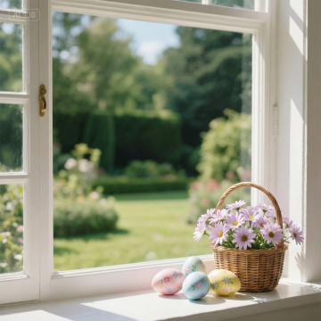 明亮的北欧风格客厅室内场景,极简主义设计,米白色布艺沙发配蓬松靠垫,窗边垂落的白色半透明纱帘,阳光透过窗户在浅色木地板上投下树影斑驳的光影效果,左侧摆放茂盛的绿色室内植物,窗外是模糊的绿色树木和草地,整体色调以米白、浅木色和绿色为主,光线柔和明亮,营造出清新、宁静、通透的居家氛围,扁平化设计风格,简洁的线条,柔和的色彩过渡,低饱和度,无明显纹理细节,强调色块与光影的平面构成感。