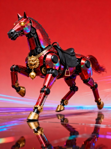 柔和、流畅的玻璃质感马的形象,马的侧脸,高像素,视觉聚在在马头,色彩斑斓美轮美奂。背景色调为纯红色。极简主义,高级大师作品。