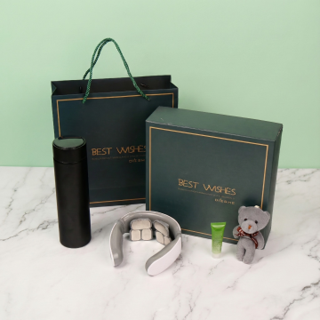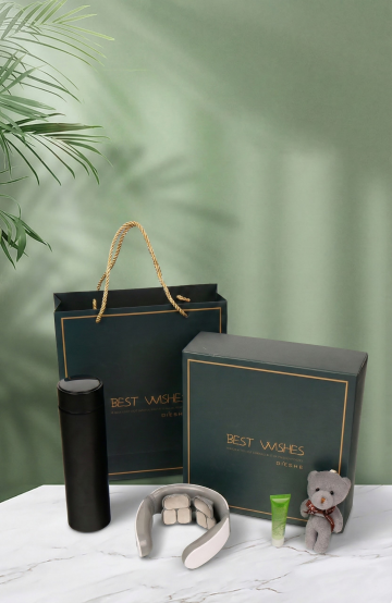 喜庆红绿配色,科技感水牙线置于礼盒中,重拟物风与塑料质感结合,双色设计凸显现代感,节日氛围浓厚。