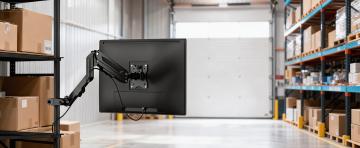 一个现代化的智能仓库内部,具有工业科技感的设计风格,主色调为蓝色和灰色,搭配白色灯光营造出明亮通透的氛围。仓库内采用高顶设计,金属框架结构的货架整齐排列,货架上存放着各种规格的箱子和物品。中央区域配备有自动化的物流设备和机器人,地面上画有黄色的引导线。天花板上安装有长条形的LED灯带和监控设备,墙壁上和货架之间的电子屏幕显示着实时的库存数据和操作信息。整个空间呈现出高度智能化、高效运作的未来感仓储环境,光影效果突出金属和玻璃材质的冷硬质感,同时通过蓝色的科技光晕增添现代感和专业度。