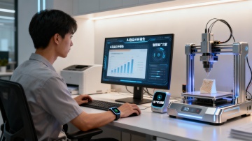 未来科技感十足的场景,深蓝色调为主,带有明亮的蓝白色发光元素,光影对比强烈,光线从机器人手指和笔记本屏幕散发出来形成光晕效果。一个人正在使用笔记本电脑,他的手放在键盘上,另一只半透明的机器人手从上方伸出,手指指向屏幕上的全息界面。周围悬浮着多个半透明的全息数据窗口,包含各种图表(折线图、柱状图、饼图)、仪表盘、圆形和方形的控制面板元素,界面线条流畅,带有科技感的蓝色发光边框。背景深邃模糊,突出前景的手部、笔记本和全息元素,整体营造出高科技、数字化、未来感的氛围,具有清晰的视觉层次,主体元素突出,细节丰富,画面具有电影感的景深和质感。