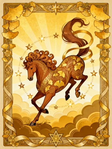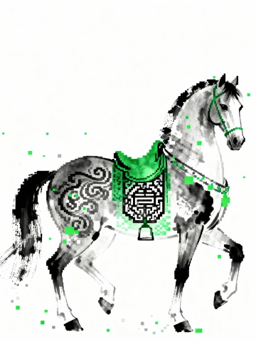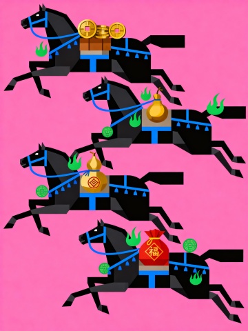 木刻画风格,图案有木刻印章质感,明显印刷肌理感,剪纸插画:主体内容为三匹装饰华丽的骏马(上方两匹为亮粉色,马身饰白色缠枝花纹与鞍具,底部一匹为黑红渐变,马身饰金白缠枝花纹与同款鞍具,鞍具带流苏吊坠),木刻印刷质感;动作行为是三匹马均呈单前蹄抬起的静态伫立姿态,造型统一且优雅;场景设定为黄绿渐变背景,背景点缀粉色曲线笔触、白色星点,背景的顶部/底部的饱和粉色缠枝花纹装饰(各一个大纹样,外形如意纹,里面是卷草缠枝花纹),图案对称精致;色调色彩以浅绿(背景)为主,搭配亮粉、黑红渐变(马身),点缀白、金(花纹细节);构图视角为纵向竖版构图,三匹马呈垂直排列,背景装饰元素分布于画面边缘;细节补充包括:马身花纹线条细腻且对称