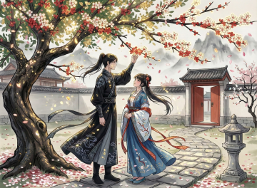 古典中式插画风,水墨山水背景,人物手持折扇,尽显雅致韵味。
