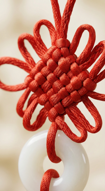 鎏金中国结搭配玉坠,水墨山水背景,融合国潮风与重拟物设计,展现中式奢华与古典优雅,寓意新春招财纳福。