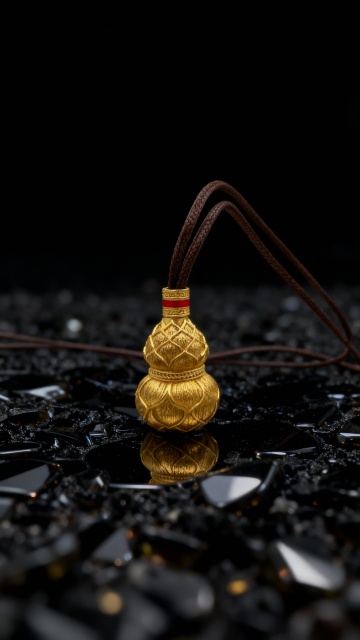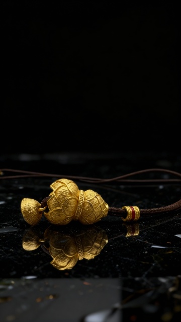图中黄金饰品形状细节不变,换一个背景,天降黑曜石镜面平铺,背景换成黑色生成高级摄影质感图片
