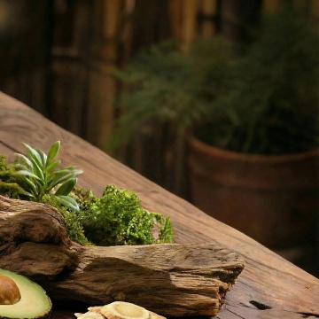 极简构图,留白60%的东方厨房场景,右侧三分之一区域放置一块边缘泛着包浆的老榆木砧板,砧板一角斜倚着半串风干的红辣椒,下方散落三两颗饱满的蒜瓣,左侧远景处虚化的土陶罐中隐约可见褐色的茶叶轮廓,光线以45度角从画面左上方切入,在砧板边缘形成一道金边,投下修长的三角形阴影,深褐色木纹与纯黑背景形成微妙的明暗层次,整体色调为赭石色与墨黑的和谐对话,材质细节保留木材的细小裂纹与辣椒的褶皱肌理,营造出空灵而充满生活温度的禅意氛围。