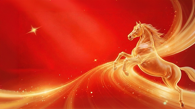生成和参考图一样的金马,发光的金色骏马在奔跑,红底金色颗粒光效,华丽金色质感,梦幻大气视觉效果详情