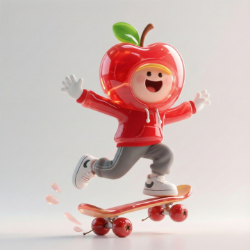 软3D风格的拟人苹果角色,身穿红色连帽衫,踩着樱桃轮滑板,充满可爱与趣味感,塑料质感光泽透亮,整体卡通风十足,洋溢青春活力。