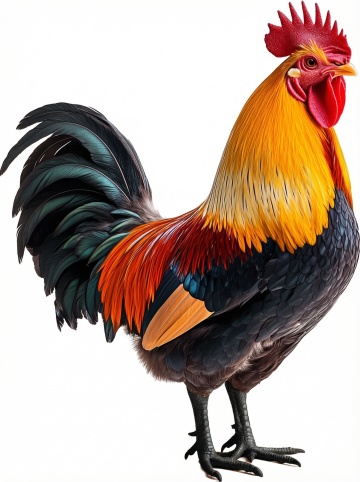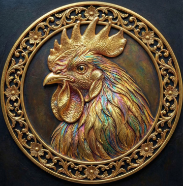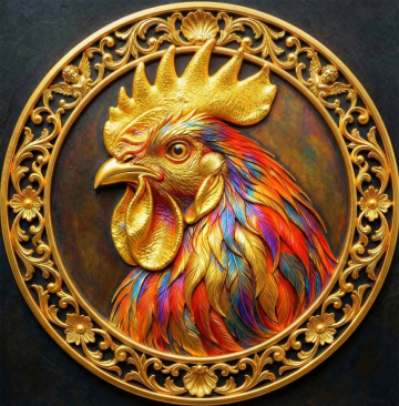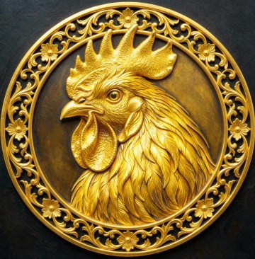 将第一张图片中的立体浮雕大公鸡图参照第二张图彩色大公鸡的羽毛颜色,质感纹理,七彩羽毛要有真实感。将图片中的七彩绚丽的大公鸡头部特写,大公鸡的羽毛七彩夺目清晰立体质感特别强有真实感,大公鸡鸡头鸡冠鸡身上的羽毛采用黄金鎏金工艺,錾刻羽毛表现细腻并且羽毛是七彩清晰饱满。图片中的圆外环欧式镂空经典浮雕雕刻花纹,花边中的花朵及小圆珠按照手表12刻度排列12颗花朵小圆珠,采用鎏金錾刻工艺,整体色彩明亮有黄金质感。
