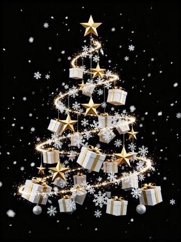3D几何圣诞树,鎏金与白礼盒交织,粒子光带环绕,雪花飘落,奢华梦幻,喜庆氛围浓郁。