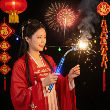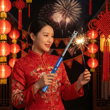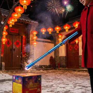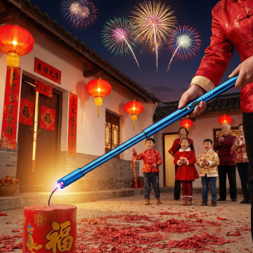 图中是鞭炮点火器,用图中产品生成场景,场景为国内过年点鞭炮场景,国内大人拿着图中产品点鞭炮引线,产品大小比例参照图二,保持产品一致,比例1:1,生成四张