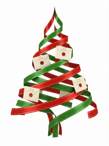扁平风几何圣诞树,红绿双色丝带交织,点缀信封装饰,喜庆感十足,节日氛围浓郁。