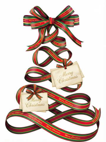 复古插画风圣诞树,红绿丝带轻拟物缠绕,印刷质感标签点缀,喜庆温馨满溢。