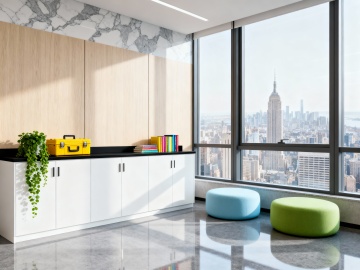现代化办公空间背景,采用高清3D渲染技术,呈现出与原图一致的超写实风格,以通透的蓝色系为主色调,搭配白色和浅灰色作为中性色,营造明亮、专业、科技感的氛围。场景中包含玻璃幕墙的高层写字楼外观,建筑线条流畅锐利,表面有细腻的金属质感和反光效果,如同原图中高耸的摩天大楼。光线从侧上方照射,形成清晰的光影对比,天空呈现渐变的蔚蓝色,点缀着少量白色云朵,增强空间的开阔感。办公区域可设置开放式工位、简约的会议桌、舒适的沙发座椅,地面采用浅色木地板或大理石材质,墙面装饰简约的艺术画作或绿植,整体布局遵循对称美学和视觉引导线,确保画面层次分明,符合现代办公环境的高效与专业特质,同时保持与原图在光影、色彩和谐度及3D质感上的高度统一。
