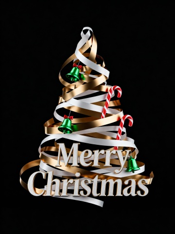 3D金属风圣诞树,鎏金与银白丝带缠绕,重拟物质感搭配绿铃铛与拐杖糖,喜庆感十足,节日氛围浓烈。