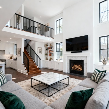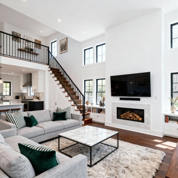 现代简约风格的客厅,整体以 “白色 + 浅灰 + 深棕 / 黑” 为主色调,氛围干净清爽又不失质感:露出白色平坦天花板,