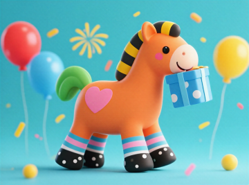 两只软萌造型的小马潮玩——粉色小马(戴红围巾、黄刘海,单眼眯起呈俏皮神态,手持带笑脸的黄色星星),骑在粉白底色带黄点的蓝角小马身上;动作行为是粉色小马呈抬手举星的活泼姿态,蓝角小马呈静态蹲坐姿态,整体互动感可爱温馨;场景设定为色彩柔和的梦幻背景:橙黄毛绒质感圆形(模拟太阳)+粉蓝渐变云朵+彩虹弧线+星星装饰,色调明快治愈;风格参考是Q版潮玩手办质感,表面呈现光滑的塑料肌理,兼具软萌可爱与潮流感;色调色彩以粉、蓝、黄为主,搭配橙、白(背景),色彩鲜亮柔和;构图视角为近景平视构图,两只小马占据画面核心区域,背景元素环绕衬托;细节补充包括:小马的塑料质感光滑带轻微光泽,围巾呈柔软布料褶皱,星星的笑脸表情稚拙讨喜,背景毛绒圆形的纹理细腻蓬松,整体呈现萌系潮玩风格的马年梦幻插画。