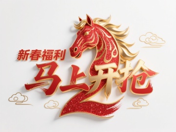 软3D风国潮设计,财神骑白马奔腾,金币飞舞,喜庆感十足,寓意“马上有钱”,融合粘土质感与鎏金元素,立体生动。