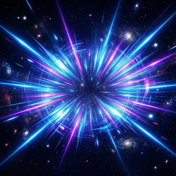 深邃神秘的暗紫色背景上,一个巨大的、散发着强烈荧光蓝光芒的多层环形能量场占据画面中心,最内层是深邃的靛蓝色虚空,向外依次是明亮的蓝紫色光环、天蓝色光环和青色光环,光环边缘锐利且带有细腻的发光粒子效果,无数道明亮的蓝白色光线从光环中心呈放射状向四周迸发,光线末端带有柔和的光晕,背景中点缀着大量细碎的蓝紫色和青色闪光粒子,整体营造出一种科技感十足、神秘而充满能量的宇宙科幻氛围,环形结构具有强烈的视觉冲击力和动态感,色彩对比鲜明且和谐,光线效果细腻,具有极高的光感和透明质感。