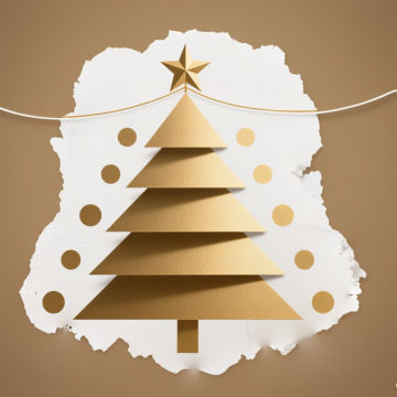剪纸风与拼贴风结合的圣诞树,红绿金白层层叠叠,几何造型简约生动,金色星星点亮节日喜庆,温馨趣味跃然纸上。