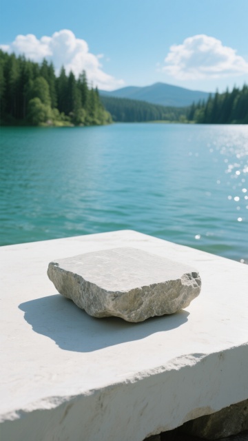 一张白色石质平台上放置着一块边缘不规则的方形石板,石板表面粗糙有自然纹理,沐浴在明亮的阳光中,投下清晰的短阴影。背景变换为宁静的森林湖畔,湖水呈现清澈的蓝绿色,湖面波光粼粼,远处是茂密的绿色森林和朦胧的远山轮廓,天空湛蓝,飘着几朵白色的积云,整体画面采用高清晰度摄影风格,色彩明亮清新,光影对比柔和,具有自然写实的质感和宁静悠远的氛围。
