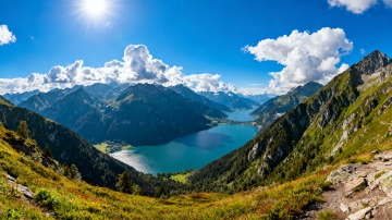 写实摄影风格的自然风光照片,画面中央是平静如镜的湖泊,湖水清澈见底,完美倒映出远处连绵起伏的雄伟山脉,山脉呈现出深绿色与灰褐色的自然岩石纹理,山顶部分笼罩着一层薄薄的、轻柔的晨雾,增添了神秘而宁静的氛围。湖岸两侧点缀着稀疏的墨绿色松树,左侧湖岸有一片红褐色的低矮植被,右侧远处隐约可见几艘停泊的小船。天空是明亮的浅蓝色,带有淡淡的云层,光线柔和,呈现出清晨或傍晚的柔光效果,整个画面构图采用对称式布局,强调山水倒影的和谐美感,色彩以蓝绿色调为主,搭配山脉的自然色系,营造出宁静、开阔、壮丽的自然景观氛围。