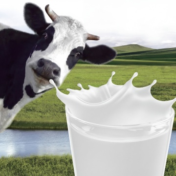 一幅超写实风格的牛奶广告创意画面,近处是飞溅的牛奶形成的白色浪花,牛奶具有极高的光泽感和流动性,表面光滑细腻,带有透明感的奶泡和悬浮的奶滴,阳光照射下呈现出柔和的高光。背景是广阔的绿色草原,草地上有两只黑白相间的奶牛在悠闲地吃草,远处是连绵起伏的绿色山丘和蓝天白云,天空中有明亮的太阳和蓬松的白云,整体画面色彩明快,以蓝天的湛蓝色和草原的鲜绿色为主色调,光影明亮柔和,营造出清新自然、纯净美好的氛围,构图采用近实远虚的景深效果,突出牛奶的质感和草原的生机。