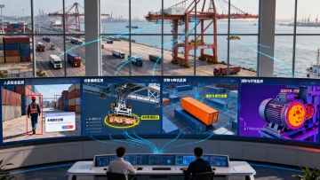 等轴视角的 3D 数字孪生工业场景,画面中心是一台未来感的电脑主机/控制中枢,显示悬浮的 AI 算法代码界面和数据云标识;周围环绕多个象征业务领域的 3D 模块:机械臂+输送平台(代表智能制造)、履带式特种机器人+水池反应堆模块(核电与异物检测)、医疗十字与手术监护界面模块(智慧医疗)、城市建筑+管道检测模块(城市排水识别)、摄像机/传感器模块(AI感知)。所有模块通过发光的数据线连接,构成信息中