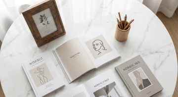 白色大理石桌面俯视上面铺着北欧ins书本,还有着照片木框在摆着