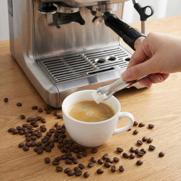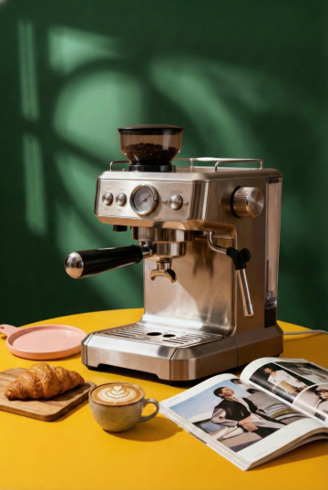 现代感金属风咖啡机,搭配暖黄桌面与绿植光影,融合工业质感与温馨氛围,轻拟物设计展现简约主义美学,传递时尚舒适的生活仪式感。
