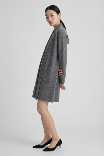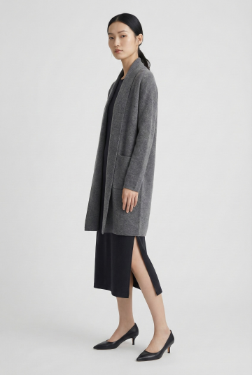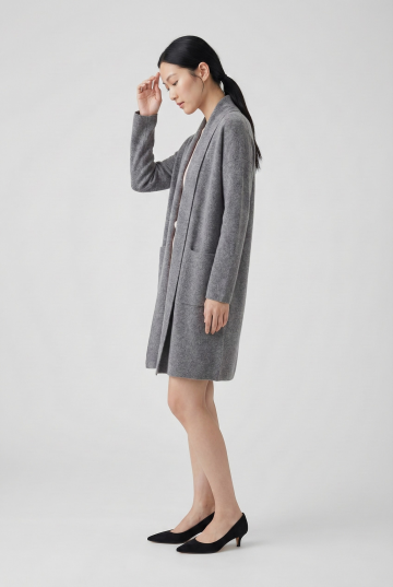 保留衣服主体,帮我生成5张电商主图。核心元素:东亚女性瘦模特(黑色长发低扎、气质清冷),25岁左右,健康肤色,有气质,淡妆,中长款开衫外套(无扣开襟 + 宽翻领设计,版型宽松(不挑身材),长度大概到臀部 / 大腿位置针织面料(可能是羊毛混纺或棉质),表面有轻微的肌理感两侧有贴袋,实用且增加休闲感),黑色尖头低跟鞋。人物动作1:身体自然站直,肩膀放松(没有耸肩或含胸),双臂轻垂于身体两侧(手部自然放松,未刻意摆造型),双腿微分开(脚尖自然朝前),整体呈现舒展、放松的状态。人物动作2:身体站直但不僵硬,双臂自然背在身后(肩部舒展,没有紧绷感),双腿微错开站立(重心更稳且显松弛),手部未露在身前,让视觉焦点集中在服装本身。人物动作3:身体侧转(呈现侧身角度),头部微低、视线自然下垂,同时一只手轻抬至额前(手指放松、未用力),另一只手自然垂于身侧,整体动作轻盈不刻意。人物动作4:身体侧向镜头(约 45 度角),上半身轻微前倾,一只手臂自然背在身后(手部放松露出指尖),头部转向镜头方向,整体肢体舒展不紧绷。人物动作5:身体呈侧身角度,上半身自然舒展,一只手臂轻搭在身侧(手部放松、指尖轻触裙摆),双腿因开叉裙呈现微错开的状态,整体没有紧绷感,动作轻盈自然。场景与构图:纯色浅灰色背景(无杂物),居中构图,竖幅画面,模特占据画面主体(全身展示),镜头焦距对准服装细节,景深适中。色彩色调:整体低饱和度柔和色调,以粉、白、浅灰为主,色彩干净通透,光线为柔和的影棚漫射光,无明显阴影,画面明亮清爽。画面风格:极简时尚穿搭展示风格,质感高级、氛围恬静温柔,无多余装饰元素,突出服装版型与材质。文字特征:无文字元素。